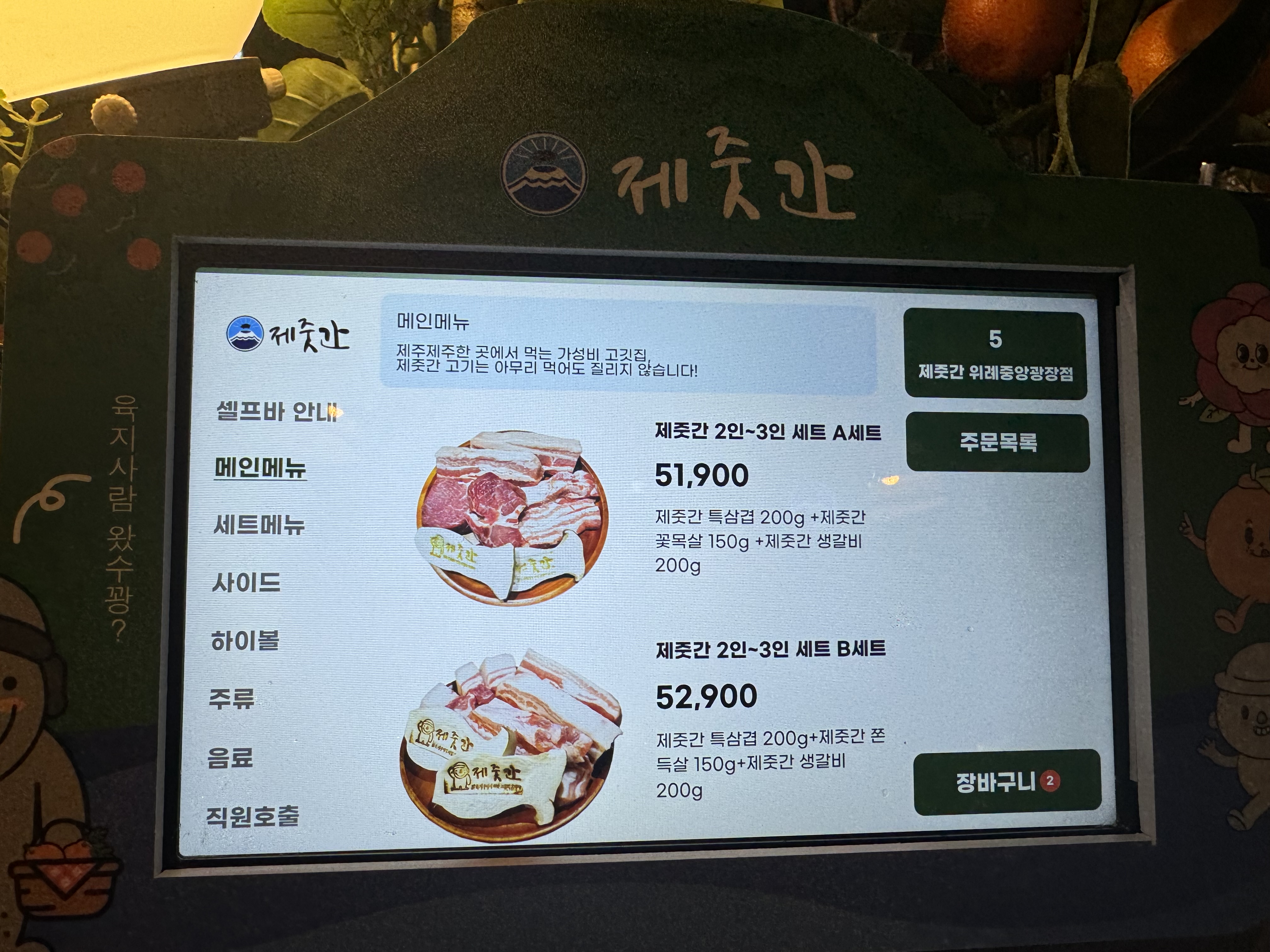 메뉴를 살펴보니 메인메뉴 세트메뉴에 제줏간 2인~3인 세트 A, B세트가 있어서 둘중에 고민하다가