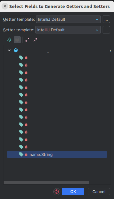 Getter와 Setter를 자동생성하려는 필드를 선택하여 Ok를 눌러주면 끝!