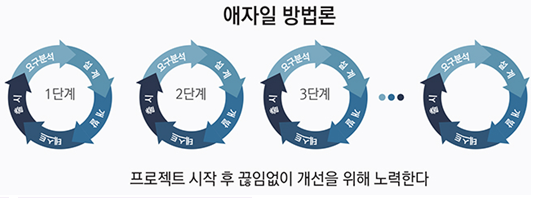 - 절차: 타당성검토-> 계획-> 요구사항분석-> 설계-> 구현-> 테스트-> 유지보수