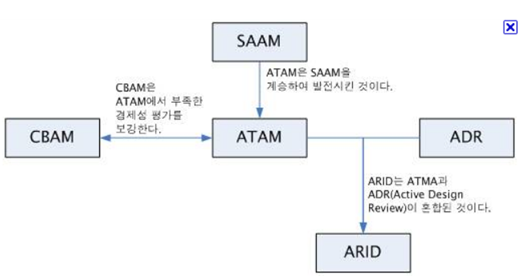 1) SAAM(Sw Architecture Analysis Method): 변경 용이성, 기능성에 집중. 평가용이해 무경험자도 활용가능.