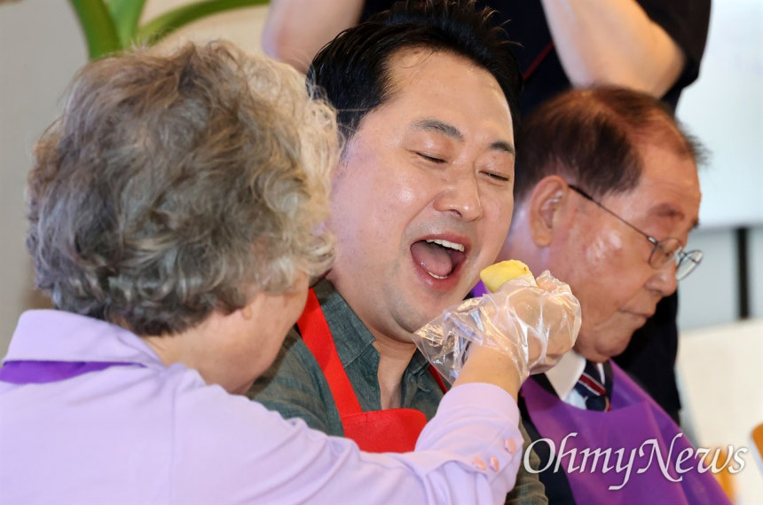 ▲ 국민의힘 추석맞이 송편빚기국민의힘 장동혁 대표가 2일 오전 서울 동대문구 동백꽃노인종합복지관에서 추석맞이 송편빚기 봉사활동에서 한 회원이 주는 송편을 받아먹고 있다.ⓒ 이정민국민의힘 지도부가 추석 연휴를 앞두고 송편빚기 봉사활동에 참석했다. 장동혁 국민의힘 당 대표와 송언석 원내대표를 포함한 당 지도부는 서울특별시 동대문구에 자리한 '동백꽃노인종합복지관'을 찾았다. '동백꽃'은 '동대문구에서 100세까지 꽃처럼 살자'의 의미를 담은 준말이다.정치권에서는 명절을 맞아 귀성길에 나서는 시민들에게 인사를 건네는 행사가 일반적이었다. 당 지도부가 복지관을 찾은 2일 오전, 더불어민주당과 조국혁신당은 서울역을 직접 찾아 시민들에게 추석 인사를 건네는 중이었다. 관행화한 이벤트 문법에서 벗어나, 다른 그림을 보여주겠다는 기획인 셈이다."오늘이 마침 노인의 날... 어르신들 편안한 삶 될 수 있게 최선 다하겠다"시작은 떡메치기였다. 장동혁 대표와 송언석 원내대표 그리고 이필형 동대문구청장 등은 돌아가며 떡메를 쳤다. 화기애애한 분위기 속에서 농담을 나누며 반죽을 망치로 두들겼다. 이어서 다같이 복지관 안으로 들어와 떡을 빚기 시작했다. 장동혁 국민의힘 당 대표는 마이크를 잡고 "오늘이 마침 노인의 날인데, 저희들이 송편을 빚어서 어르신들을 대접할 생각을 하니까 마음이 따뜻해진다"라고 말했다.그는 "우리 조상들은 나라가 더욱 발전하고, 융성해지기를 바라는 마음으로 예전부터 반달 모양으로 송편을 빚었다고 한다"라며 "보름달은 작아질 일만 있는데 반달은 계속 차오를 일만 있기 때문에 나라가 발전하고, 융성하는 마음을 담았다고 한다"라고 의미를 되새겼다. "송편에 속을 가득 담아서 오므리는 것은, 송편을 빚는 사람의 희망이 밖으로 새어나가지 않고, 다 이루어지기를 바라는 뜻을 담았다고 한다"라고도 부연했다.