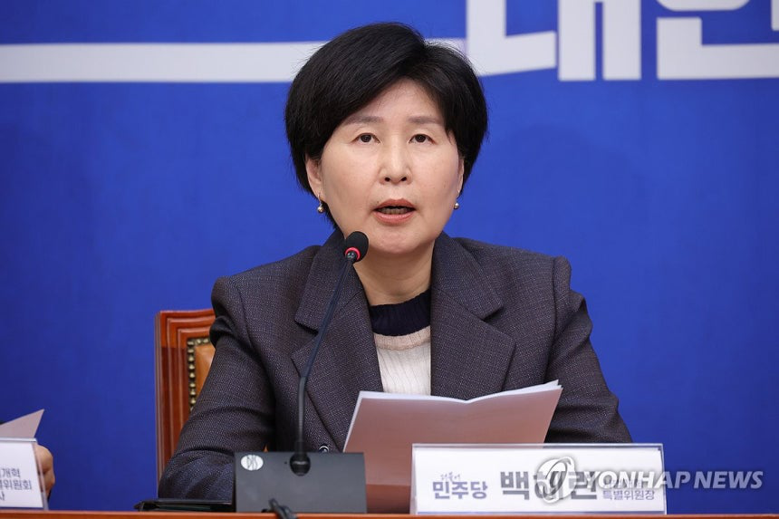 (서울=연합뉴스) 황광모 더불어민주당 백혜련 사법개혁특별위원회 위원장이 20일 서울 여의도 국회에서 열린 사법개혁특별위원회 사법개혁안 발표에 참석해 사법개혁안을 발표하고 있다. 2025.10.20 hkmpooh@yna.co.kr