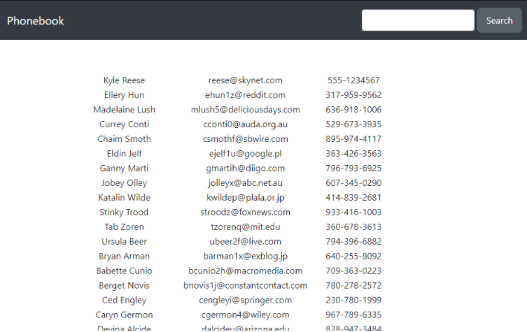 해답은 Wildcard 였습니다. Username과 Password 에 *(asterisk) 를 넣고 Login 버튼을 누르니 로그인이 되었습니다. 그리고 Search 입력 칸에 space(띄어쓰기)를 넣고 Search 버튼을 눌러 전체 검색을 해보았더니 전화번호 목록이 나왔습니다.