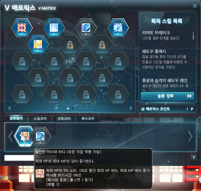 렙 200 찍고 V매트릭스 코어 스킬 사용하고싶어서