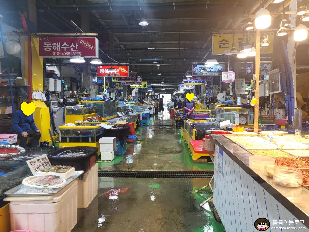직판장에서 회, 조개 등을 사서 쌈채소 등 야채들과 함께 테이블에 앉아 먹을 수 있어요