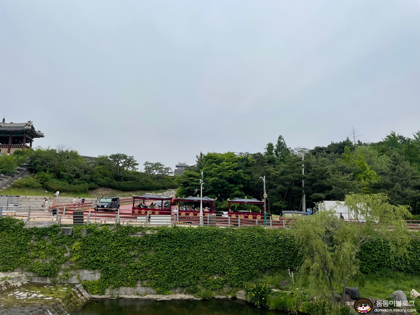 방화수류정 근처에 있는 빨간 도로에는 수원화성을 둘러볼 수 있는 화성어차가 돌아다니고 있었어요.